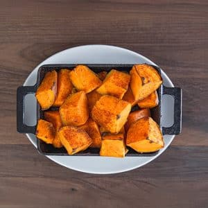 parmesan crusted grilled chicken over butternut squash mash and finished with garlic lemon butter and crispy prosciutto pieces