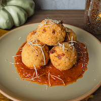 5 risotto balls stuffed with crab cake and melted cheese on a bed of vodka sauce