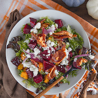 mixed greens, roasted butternut squash, beets, onions, crispy prosciutto and candied pecans tossed in