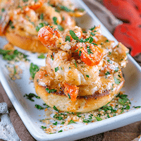 mini lobster tails in a garlic lemon butter sauce with fresh tomatoes over garlic bread