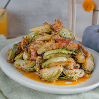 crispy brussel sprouts tossed with bacon bits and OLD BAY® honey aioli