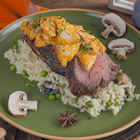 6 oz bistro filet over a mushroom pea risotto topped with a crab cognac sauce