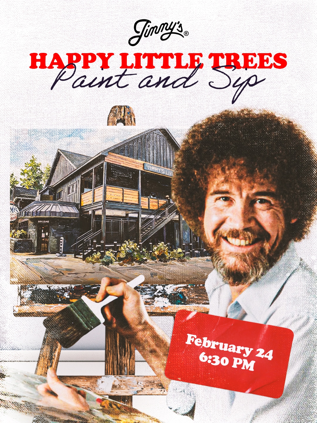Join us at Jimmy’s for a relaxing and creative evening inspired by the legendary Bob Ross! Channel your inner happy painter as we create our very own “Pretty Little Trees” masterpiece, featuring those iconic joyful landscapes with lush mountains, fluffy clouds, and of course, plenty of happy little trees.