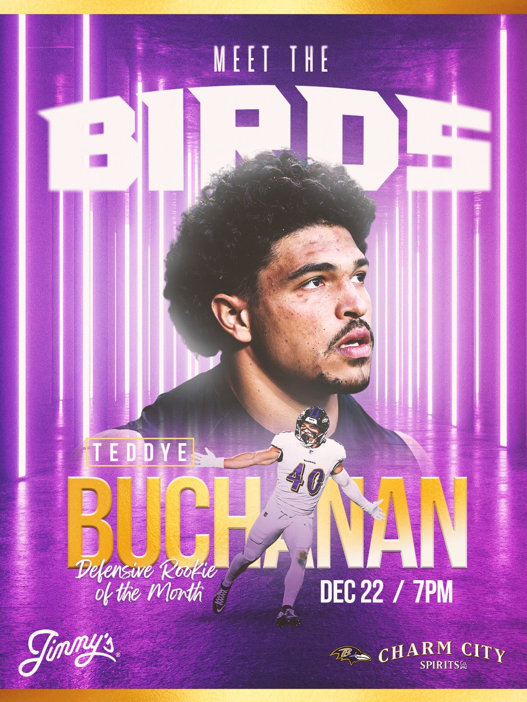 The Final 2025 Edition of our “Meet The Birds” Series will be hosted by The AFC Defensive Rookie of the Month, Teddye Buchanan! The 4th round pick is emerging as an aggressive playmaker for The Ravens – helping the team hit their stride as they march towards the playoffs! On December 22nd, he comes to Jimmy’s for a very special evening with The Ravens Flock! Teddye’s list of achievements is growing rapidly – and also includes an All-ACC 1st Team selection!