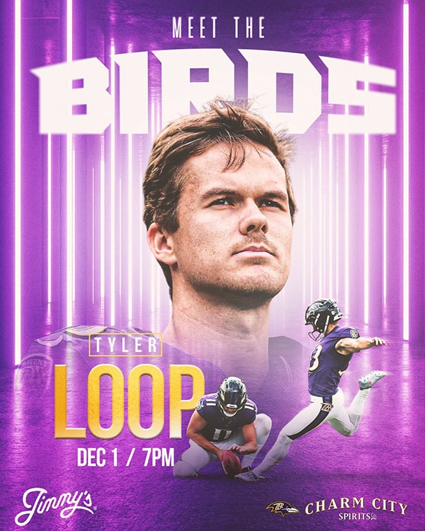 The December Edition of our “Meet The Birds” Series will be hosted by the team’s electrifying rookie kicker – Tyler Loop! Tyler is the first kicker ever drafted in the franchise’s 30 year history! On December 1st, he comes to Jimmy’s for a very special evening with The Ravens Flock!